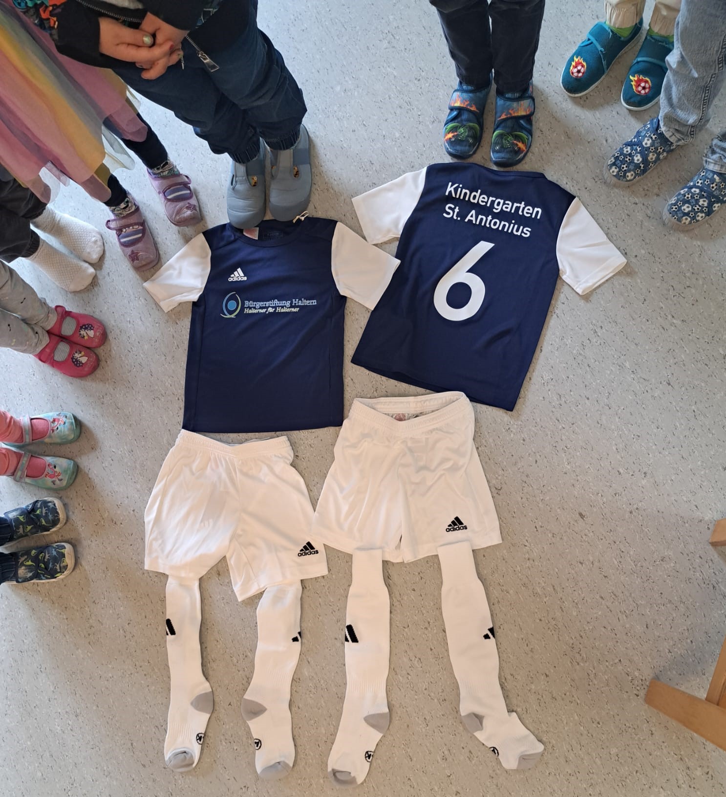 Das große Kita-Fußballturnier stand an und zwei Kitas hatten bisher keine eigenen Trikots. Die Bürgerstiftung schaffte Abhilfe und stattete sie mit jeweils 10 Trikots, weiße Hosen und Stutzen aus. Hermann Bösing und Reinhild Tuschewitzki waren zur Übergabe beim St. Antonius Kindergarten in Lavesum. Zum Familienzentrum an der Conzeallee wurde die Vorsitzende von Maik Schrief zur Überreichung begleitet. Überall war die Freude riesig und die angehenden Fußballer schlüpften gleich zur Probe in die Trikots.